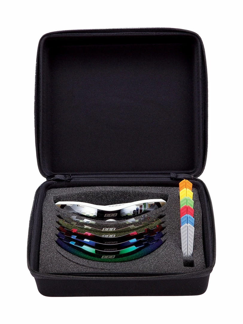 Complete case comes with 6 different lenses and 7 temple tip colours.