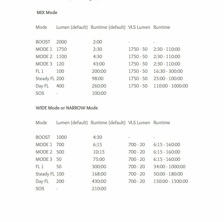 8 modes: Boost mode / Mode 1/ Mode 2 / Mode 3 / FL 1 / Steady Flash / Day Flash / SOS